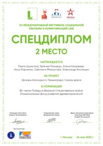 Наш фильм «Доноры блокадного Ленинграда. Сквозь время» стал лауреатом этого фестиваля.